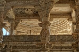 En Ranakpur, nos deleitaremos en la serenidad del exquisito Templo Jain, una joya arquitectónica construida durante el reinado del generoso monarca Rana Kumbha en el siglo XV. Este templo es conocido por su impresionante sótano de 48,000 pies cuadrados, que cubre todo el complejo. Contemplaremos la belleza de sus cuatro santuarios subsidiarios, veinticuatro pasillos con columnas y elegantes cúpulas sostenidas por más de cuatrocientas columnas intrincadamente talladas. Las ninfas esculpidas que tocan la flauta en diversas posturas de danza a 45 pies de altura son un espectáculo fascinante. Mientras exploramos este lugar sagrado, seremos cautivados por la belleza y la artesanía única de sus 1,444 columnas talladas con detalle.
