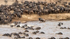 Los Cruces del Río Mara: Este es el momento que todos esperamos. Observaremos cómo miles de ñus se agrupan en las orillas del río, vacilando, avanzando y retrocediendo en una danza nerviosa. La tensión es palpable. De repente, uno salta, luego otro, y en cuestión de segundos, la avalancha comienza. Miles de animales se lanzan por los acantilados hacia las aguas turbulentas, donde los cocodrilos del Nilo, algunos de más de 5 metros, esperan pacientemente.